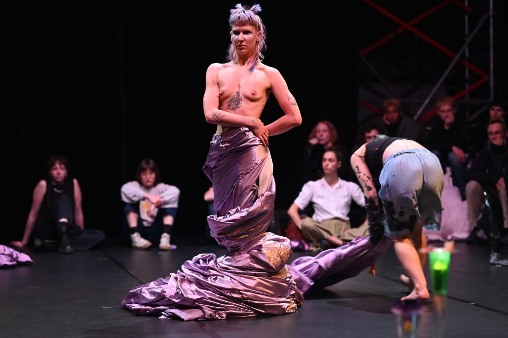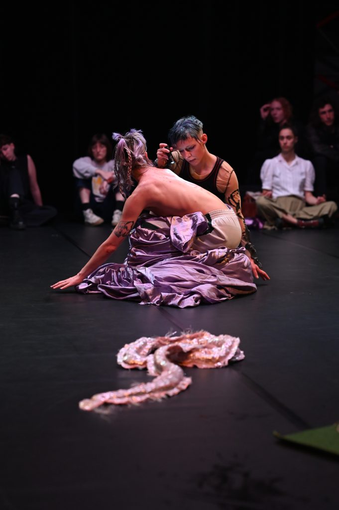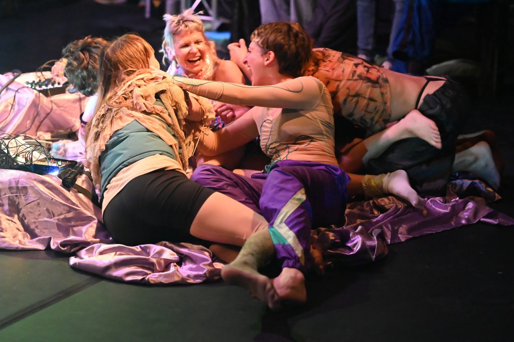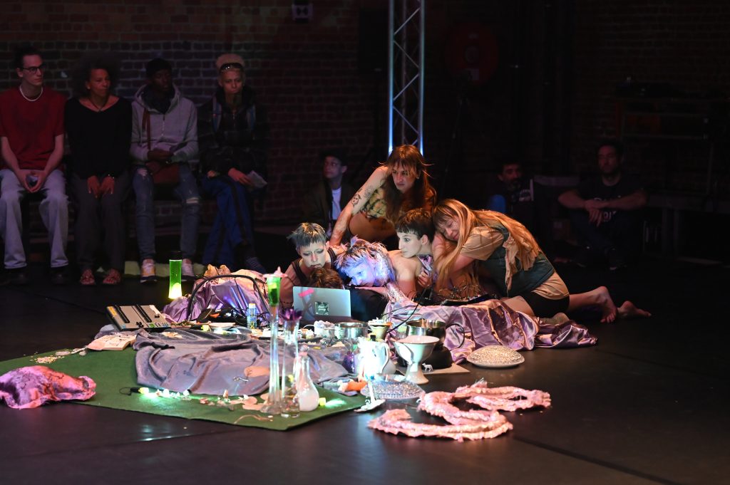 La recherche prend sa source dans le concept de symbiose en biologie et les propositions de queerféminismes spéculatifs formulées par Donna Haraway. La pièce aborde aussi l’adolescence, ses transitions et fantasmes ; l’individualité dans des dynamiques collectives ; l’écoute retrouvée, l’écologie, le recyclage ; la beauté des corps queer et trans.