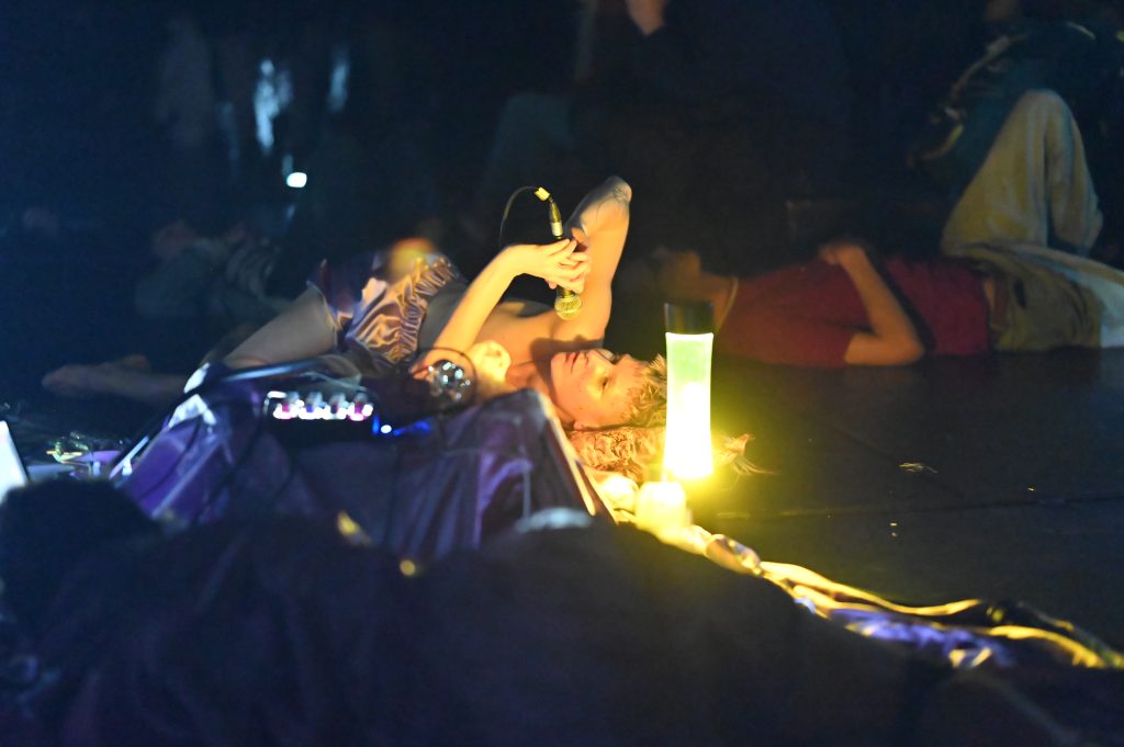 Un corps émerge au centre du cercle, formé par les spectateur.ices assis.e.s, celui de Lou. Face contre terre, ce corps se dresse progressivement, fait l’épreuve de ses os, de sa musculature, de la force contenue dans son bassin, de la gravité. Dans cette trajectoire de la chair apparaissent des images plus connues, identifiables. Du dinosaure à la divinité, des fictions qui naissent et meurent. On entrevoit d’autres luttes, contre soi et avec soi. C’est une traversée vers la joie libératrice, qui célèbre l’adaptation, la transformation, l’entre-deux et l’auto-détermination.